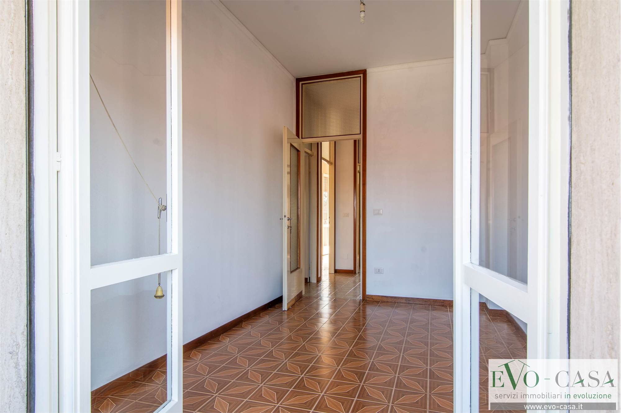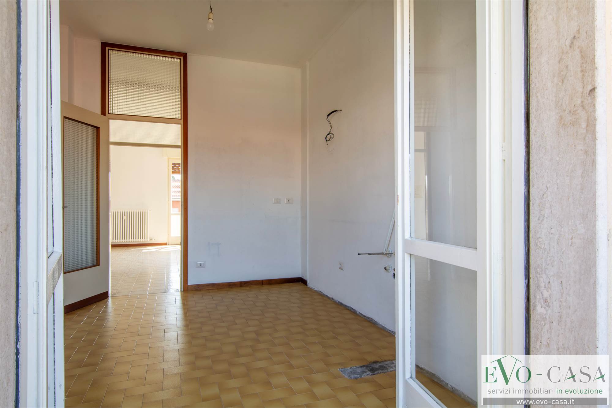 L'ingresso conduce al soggiorno, grande e molto luminoso grazie a finestra e porta finestra che affacciano sulla piazza con un balcone.