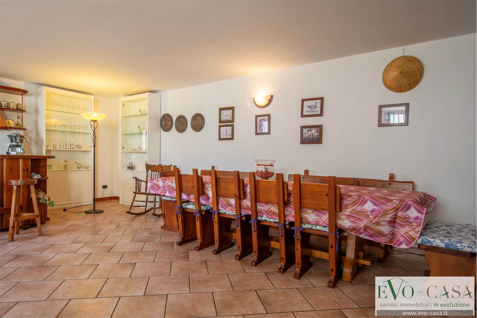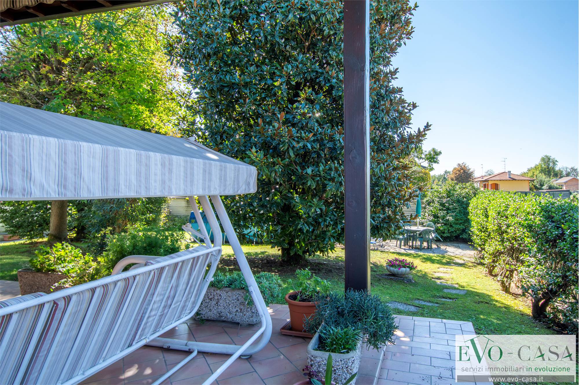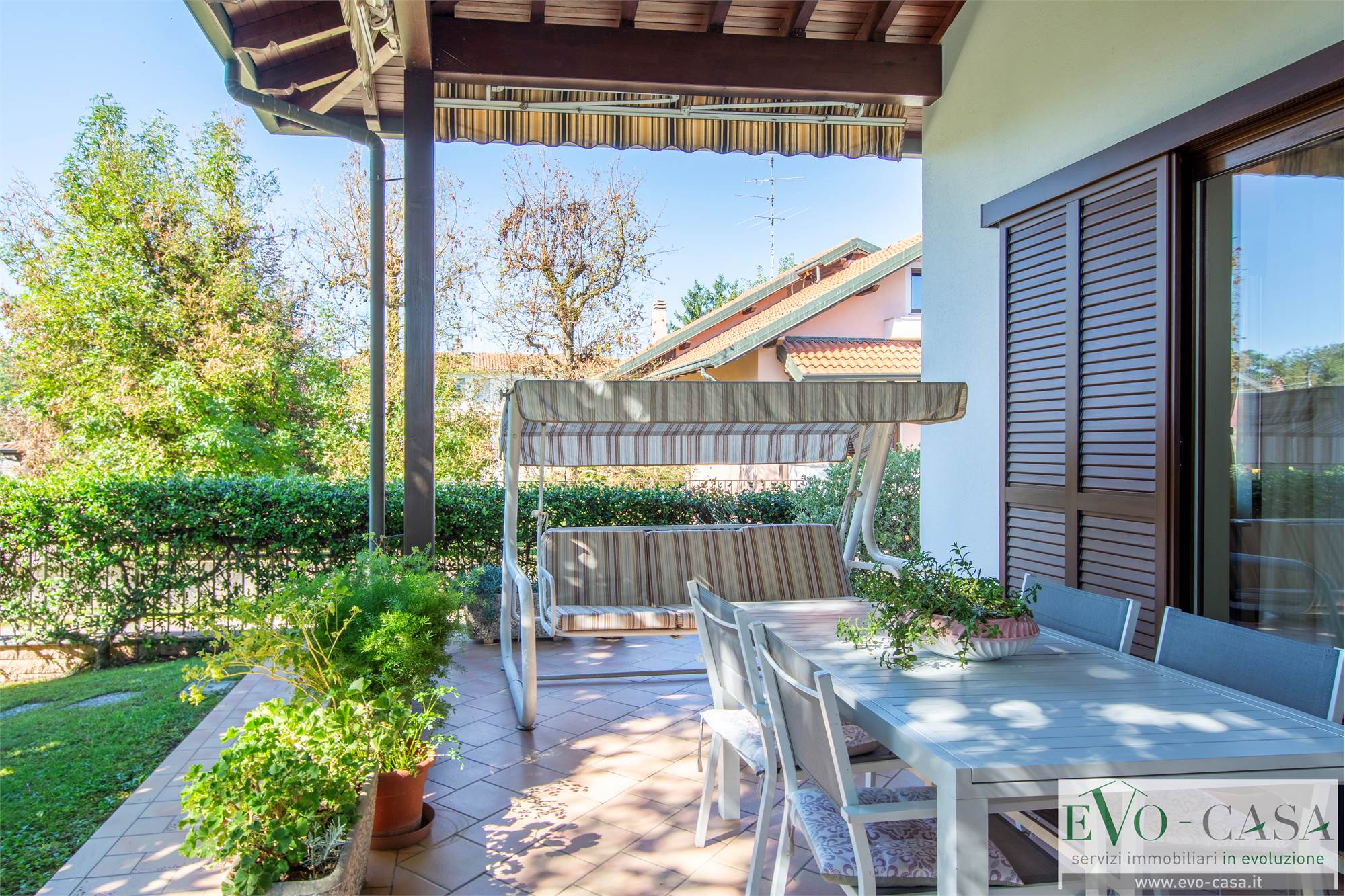 Una particolare menzione la merita il porticato a cui si accede dal soggiorno e dalla cucina. Una bella vista sul giardino e dimensioni tali da ospitare un tavolo per 8 persone e anche un dondolo.