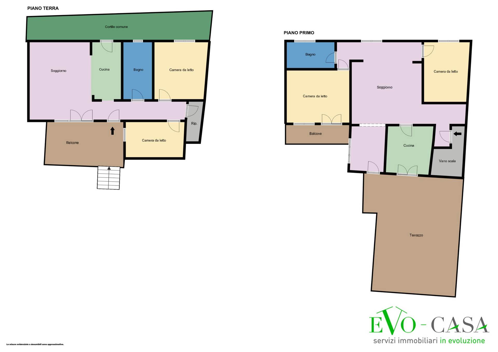 Al piano terra, con il proprio ingresso indipendente, si sviluppa il primo appartamento. La zona giorno è composta da una cucina a vista e da un soggiorno; quest'ultimo gode di una doppia esposizione che permette l'accesso diretto a un balcone da un lato e al giardino comune dall'altro, creando un piacevole dialogo con lo spazio aperto. La zona notte si completa con due camere da letto, un bagno e un funzionale locale ripostiglio.