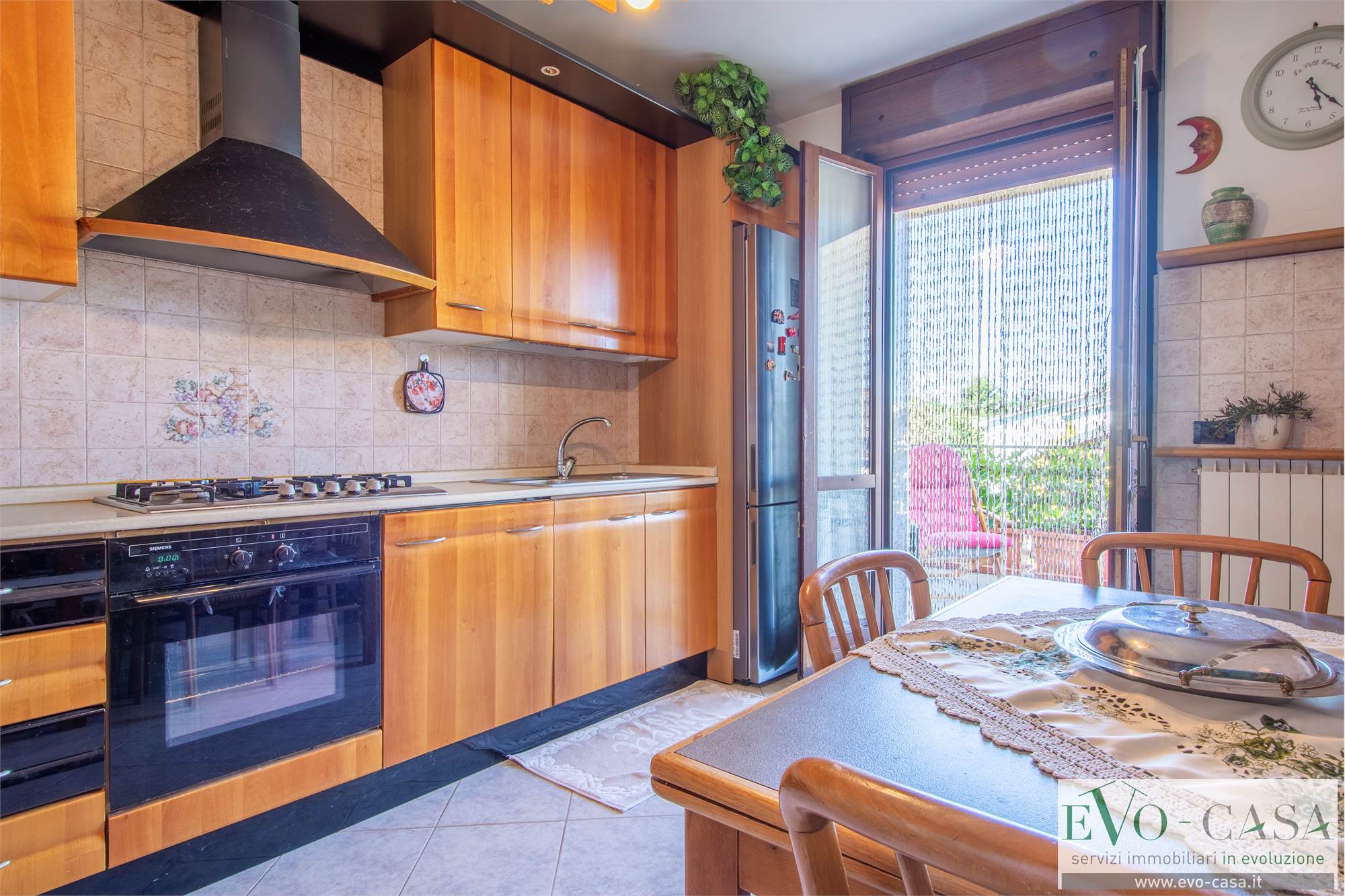 Dal terrazzo si accede anche alla cucina, abitabile, separata dal soggiorno solamente da un muro che eventualmente può essere eliminato per creare un open space.