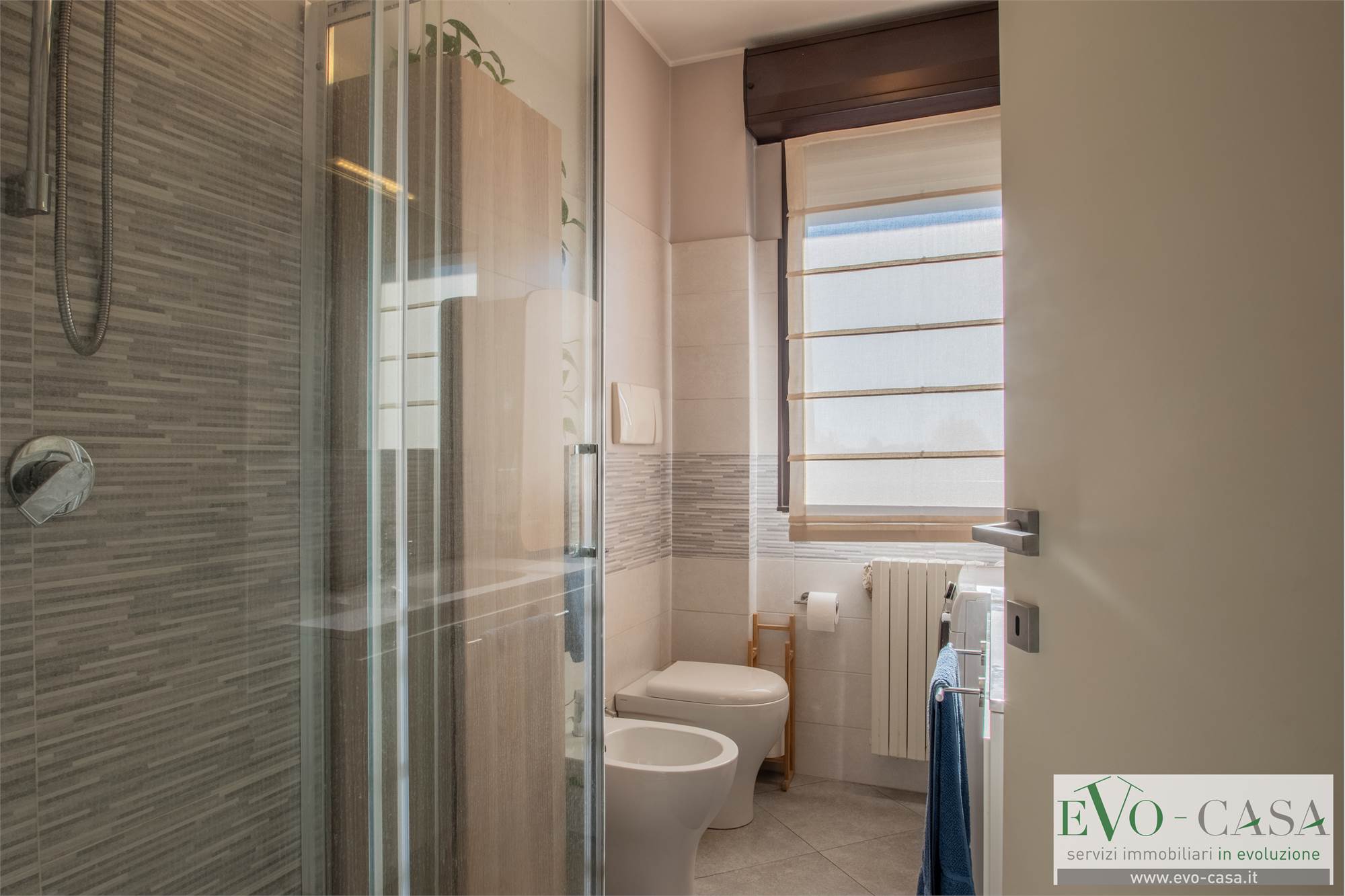 Un comodo disimpegno conduce alla zona notte, studiata per garantire privacy e funzionalità. Qui si trova un bagno moderno, completo di doccia, sanitari e lavatrice, pensato per rispondere alle esigenze quotidiane con stile e praticità.
