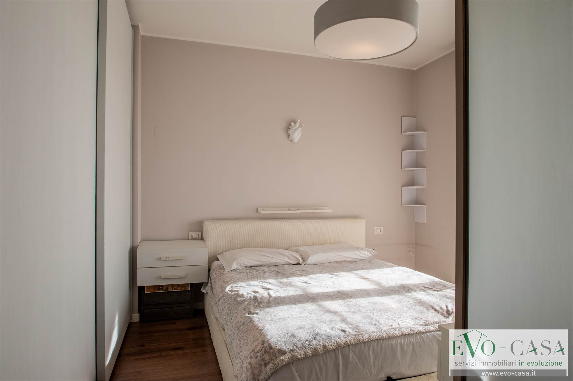 La camera da letto, anch’essa molto luminosa, gode di un secondo balconcino che amplifica la sensazione di apertura e rende l’ambiente particolarmente piacevole.