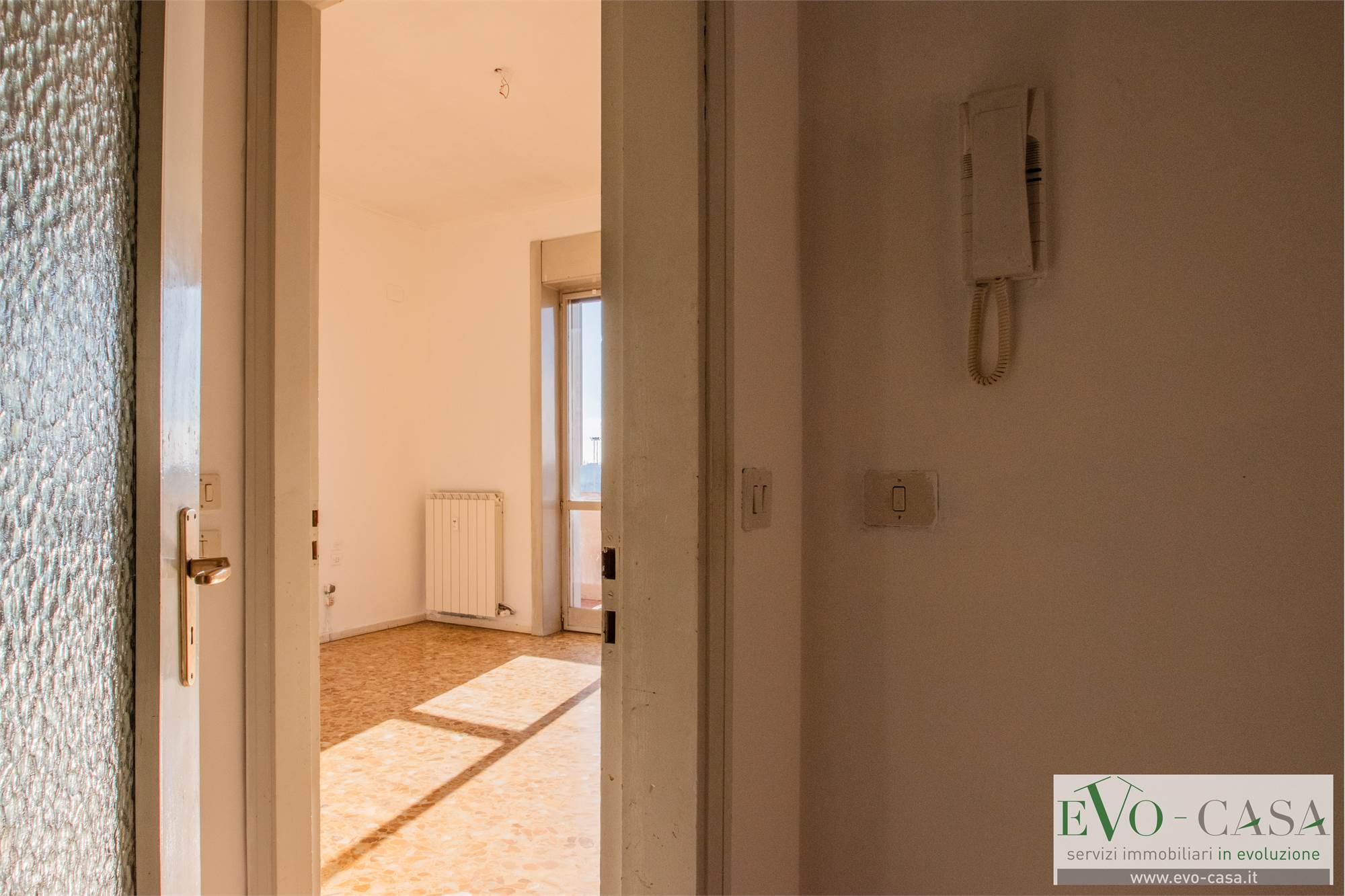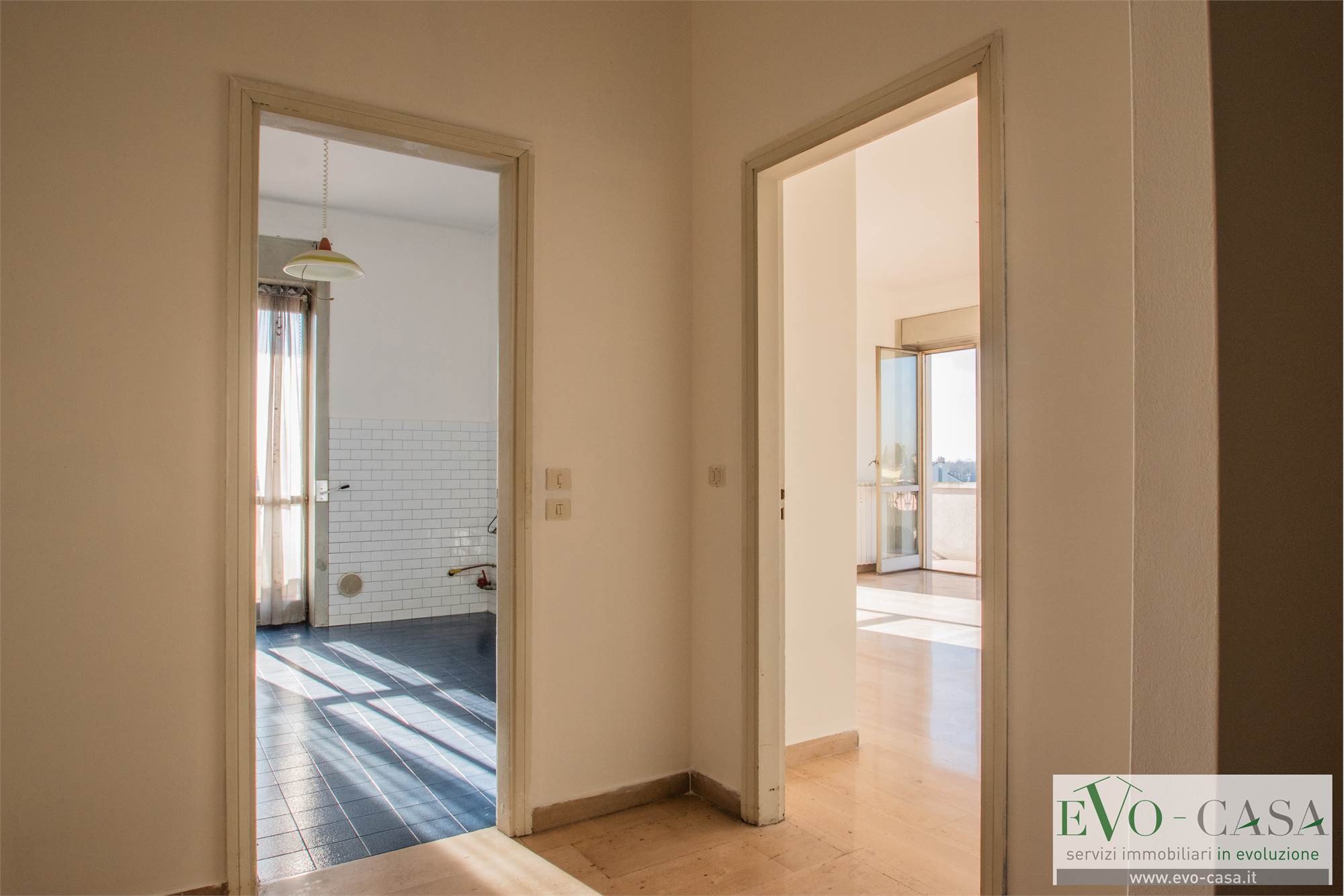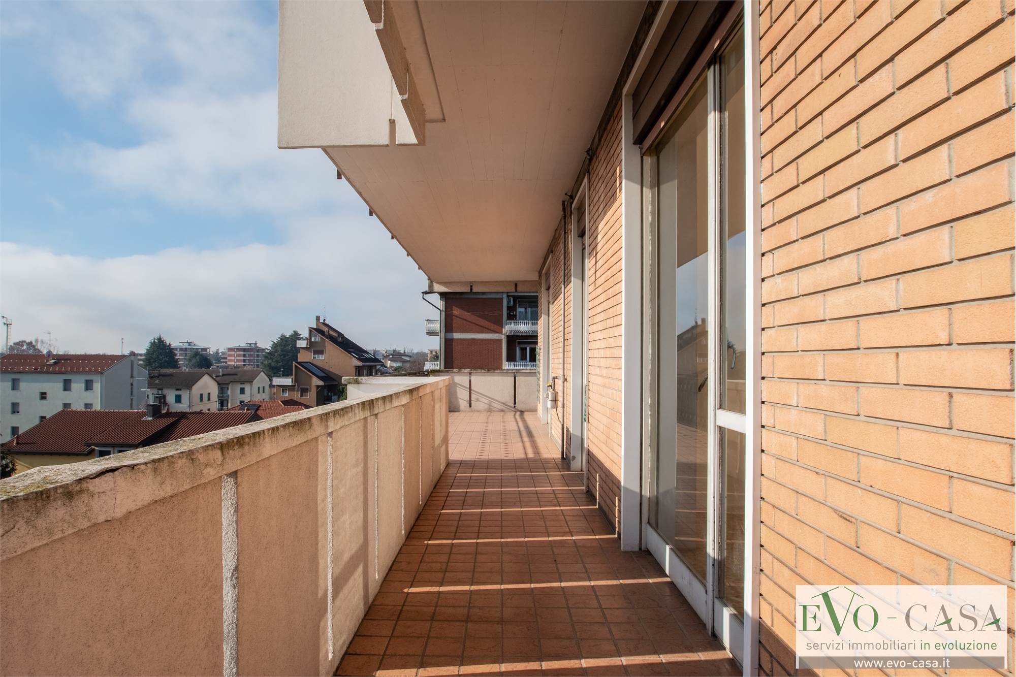 L’ingresso dell'abitazione si apre su un ampio disimpegno che organizza con razionalità i diversi ambienti della casa. Il vero valore aggiunto dell’abitazione è senza dubbio il grande terrazzo perimetrale che abbraccia oltre la metà dell’appartamento, regalando una vista aperta e una luminosità straordinaria a ogni stanza.