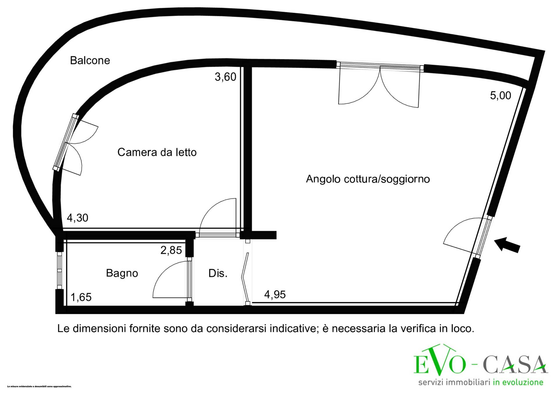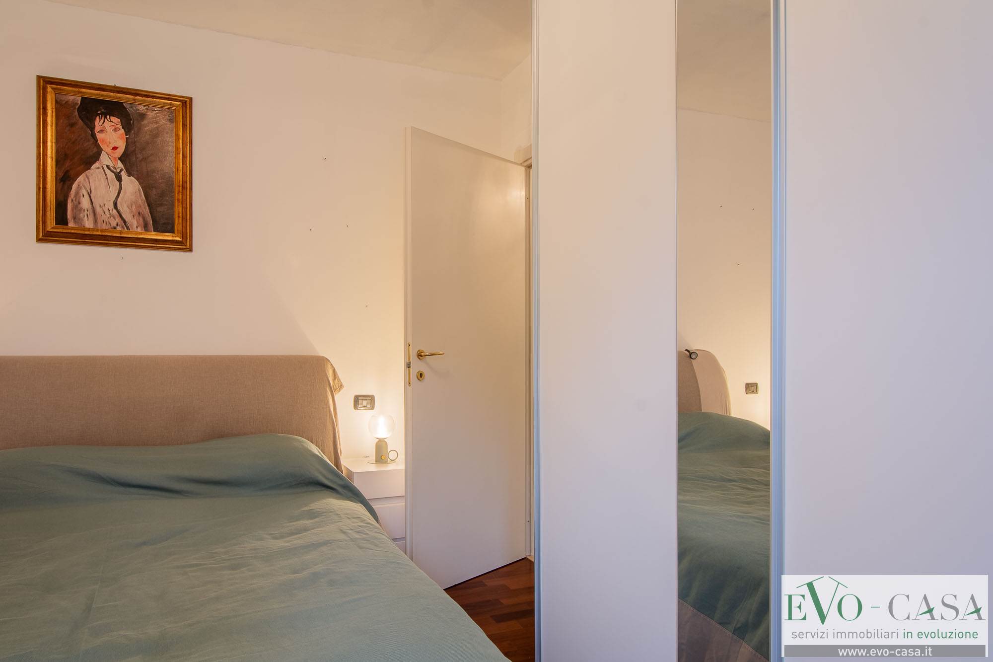 La camera matrimoniale, anch’essa con affaccio diretto sul balcone, è un ambiente ben organizzato, capace di accogliere con naturalezza un arredo completo.