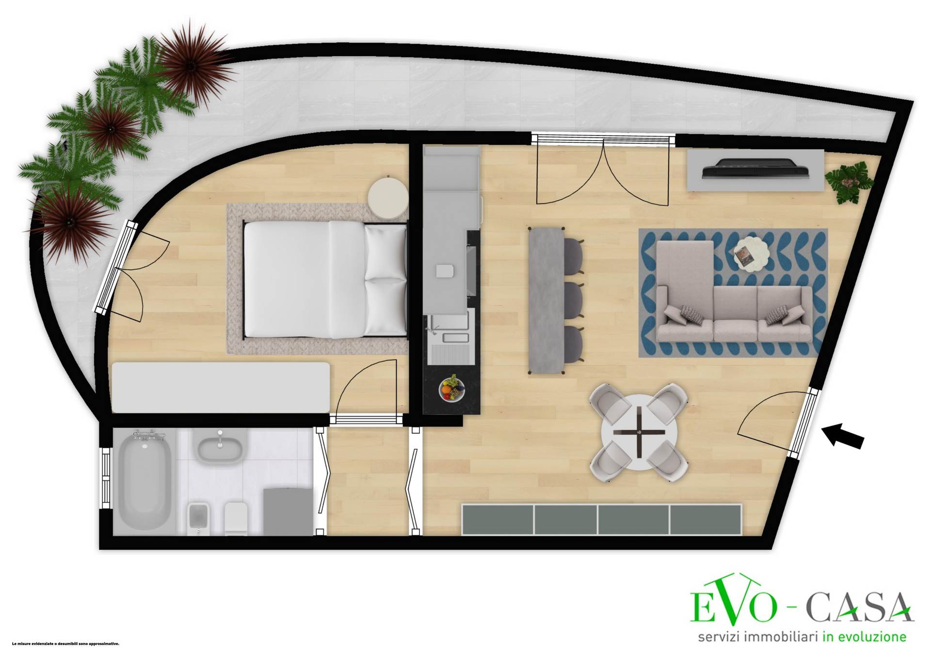 La cucina a vista, versatile e moderna, è predisposta per accogliere un’isola o una penisola, mentre l’intero ambiente si estende naturalmente verso l’esterno grazie a un ampio balcone che serve anche la camera.