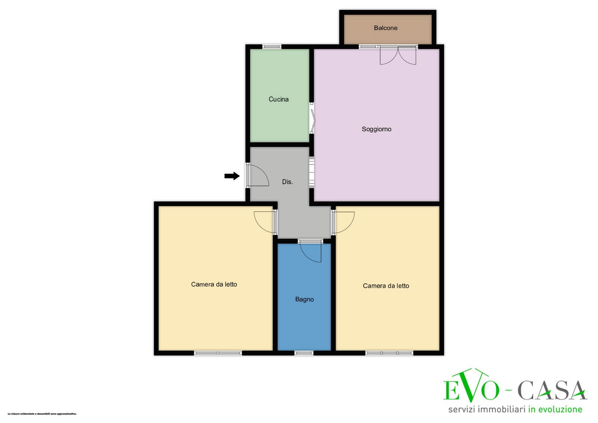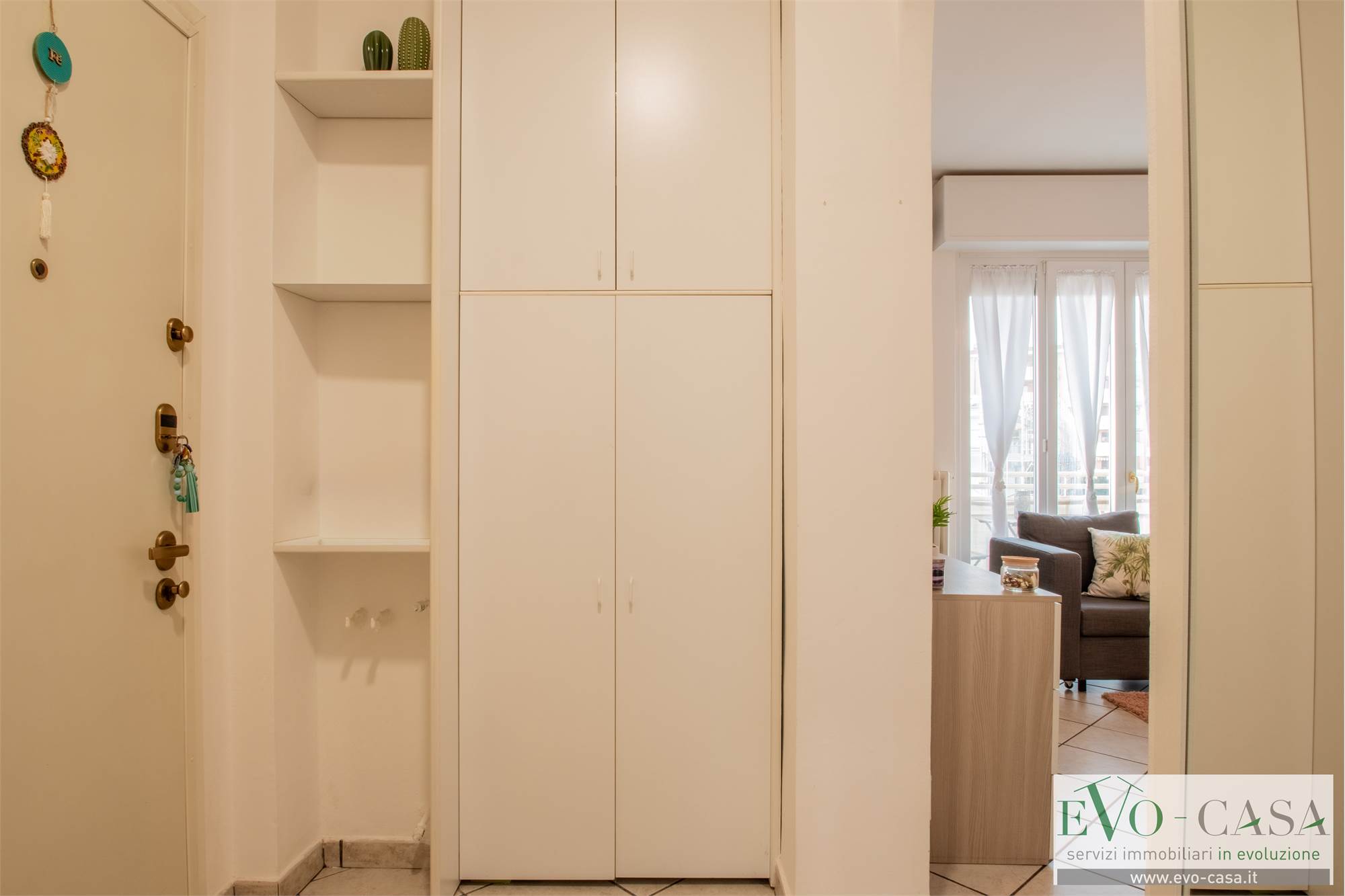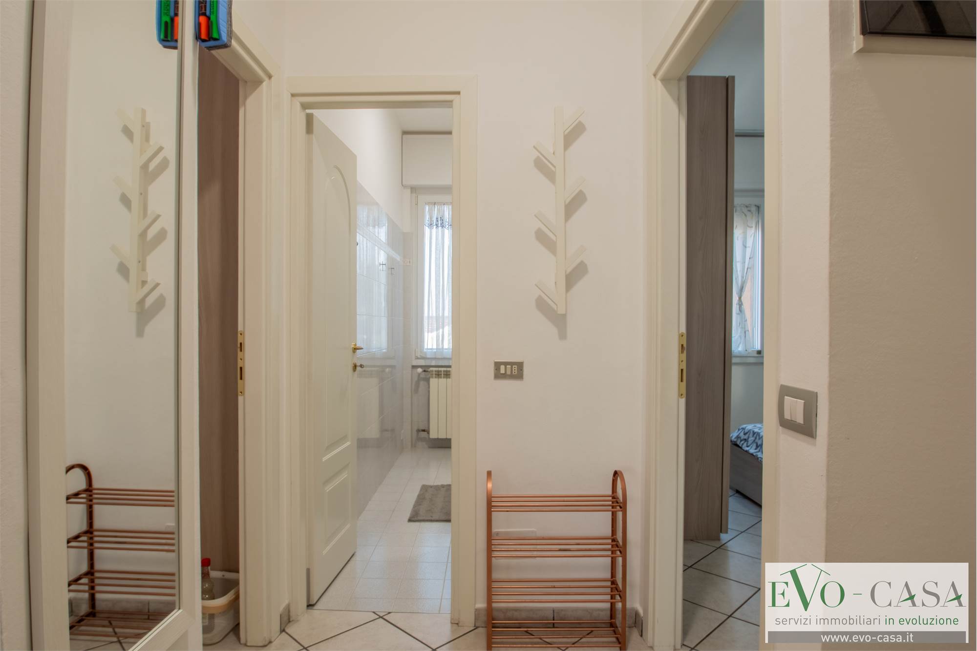 L’abitazione si apre su un pratico disimpegno che organizza perfettamente gli ambienti, dividendo con razionalità la zona giorno dalla zona notte.